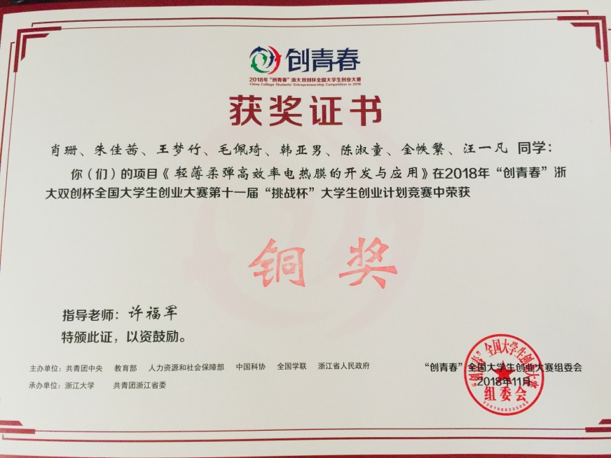 11月3日,2018年“创青春”全国大学生创业大赛在浙江大学落下帷幕,本届大赛是党的十九大之后举办的第一届“创青春”大赛,大赛以“弄潮创青春、建功新时代”为主题,于今年3月全面启动,全国共收到2200余所高校的逾百万名大学生、15万余件作品报名参赛。经过各高校校赛、各省级竞赛、全国复赛选拔,共有来自全国31个省(自治区、直辖市),以及新疆生产建设兵团、香港特别行政区、澳门特别行政区197所高校的369件作品入围终审决赛。91club 许福军老师指导的《轻薄柔弹高效率电热膜的开发与应用》项目在创业计划赛中突出重围,力夺铜奖。