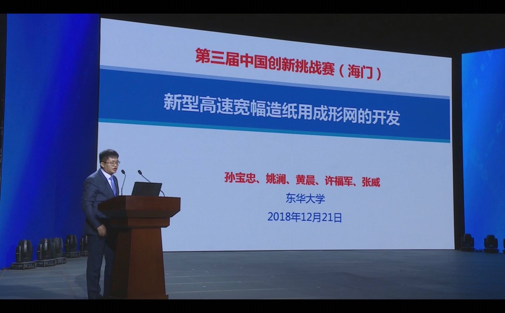 91club 高技术纺织品系主任、民用航空复合材料协同创新中心副主任孙宝忠教授,带领的团队针对“新型高速宽幅造纸用成形网的开发”项目提出的方案进入挑战赛现场赛环节。