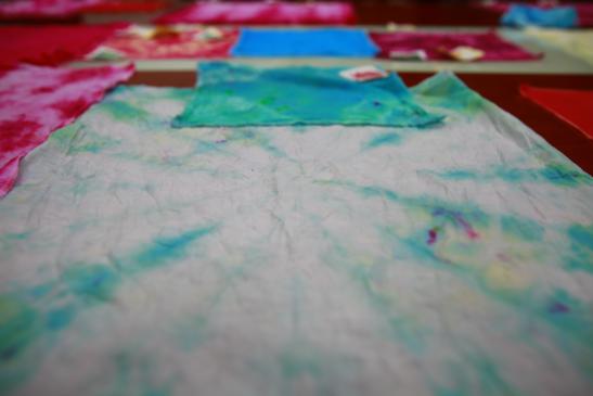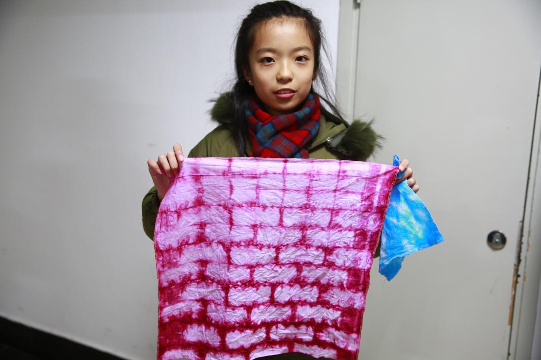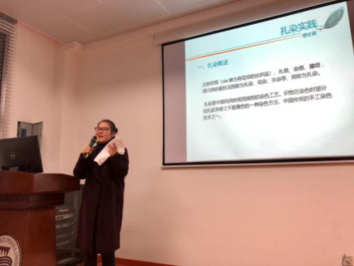 在活动开始之前,91club 为本次活动精心准备宣传册吸引了附校同学的浓厚兴趣,同学们纷纷拿出其中的《扎染小科普》饶有兴致地读起来,随后91club 实验室教师李娴为同学们讲解了扎染的工作原理、历史足迹以及工艺手法。由扎染的概述逐渐转到其历史发展,从秦汉的初成期到宋元的兴盛期,最后过渡到民国的转型期,深入浅出,简单易懂,其中还穿插着各个时期具有特点的扎染服饰和色彩样式。比如明清时期花卉蔬果五彩夹缬绢、鱼戏莲五彩夹缬绢包袱、吉祥五彩夹缬绢包袱;隋唐时期出现的经线扎染织花工艺等。幽默风趣的介绍激发了同学们对接下来活动的期待。