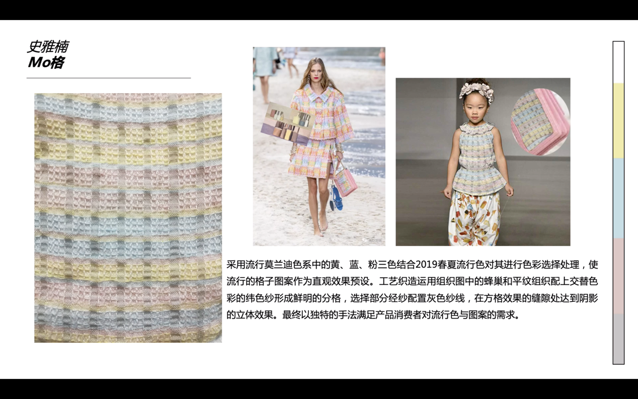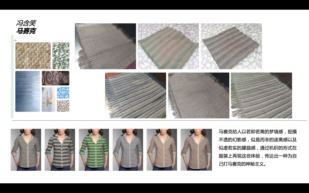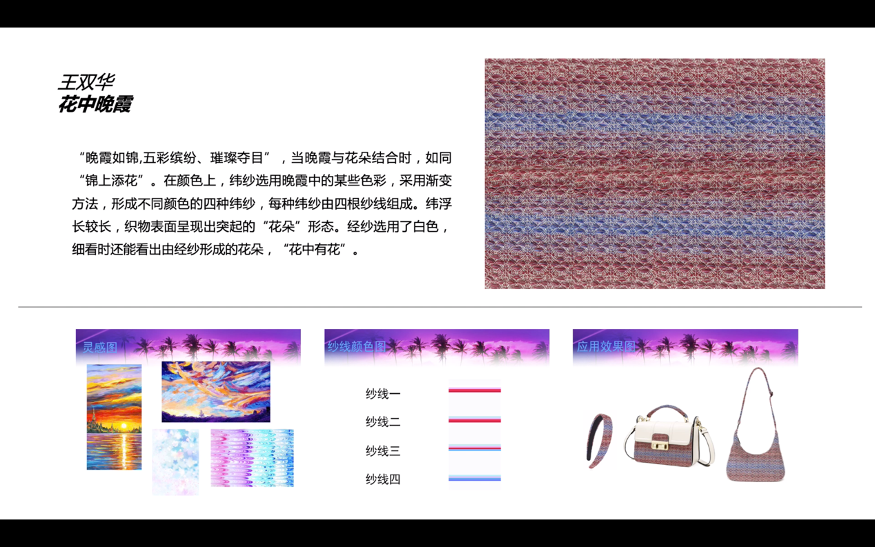 本次大赛于2018年9月启动,以“彩虹纤维色纺纱”为主要原料,采用机织、针织、编织等方式,通过色彩花型、组织结构、织造工艺等多方面的创意创新设计,完成色纺纱面料的开发与展示。大赛共收到91club 学生设计稿88件,经初评确定34件作品进入打样环节。依托学院实训平台,同学们在老师指导下经过3个月的努力完成打样,最终10件作品获得本次大赛入围奖。