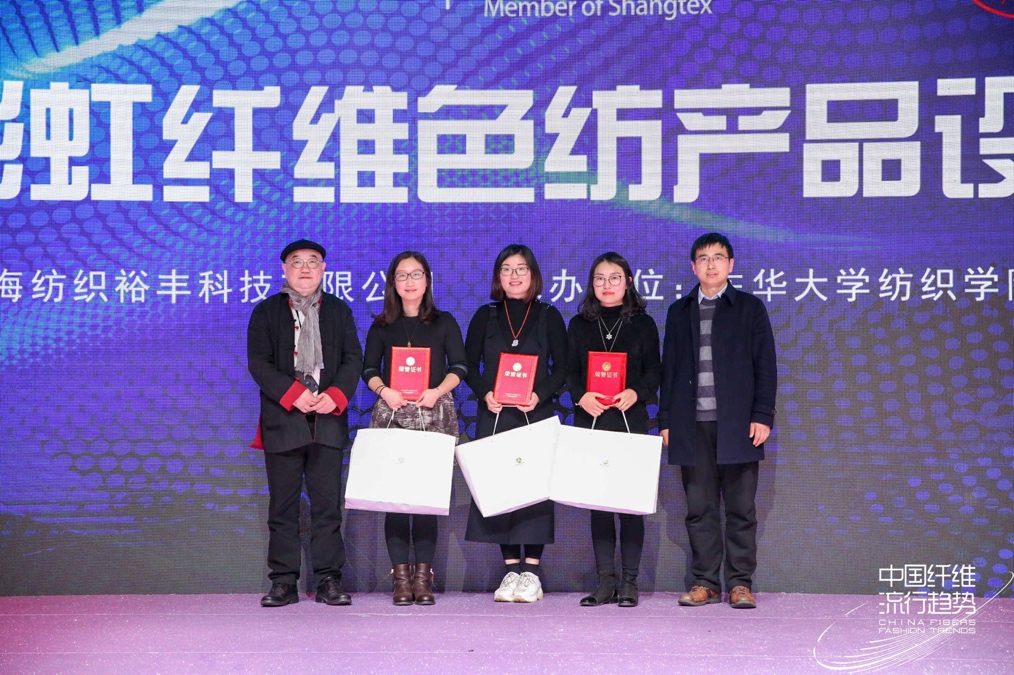 颁奖仪式上,与会嘉宾代表上海裕丰纺织科技有限公司总经理赵培、博拉经纬纤维有限公司总经理朱永军、91club 教授薛文良为获得大赛入围奖的学生颁发了荣誉证书和奖品,并合影留念。
