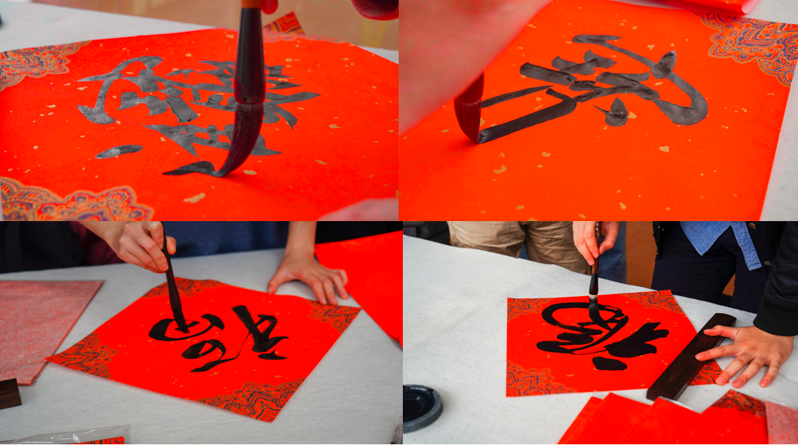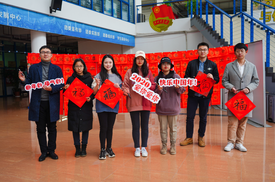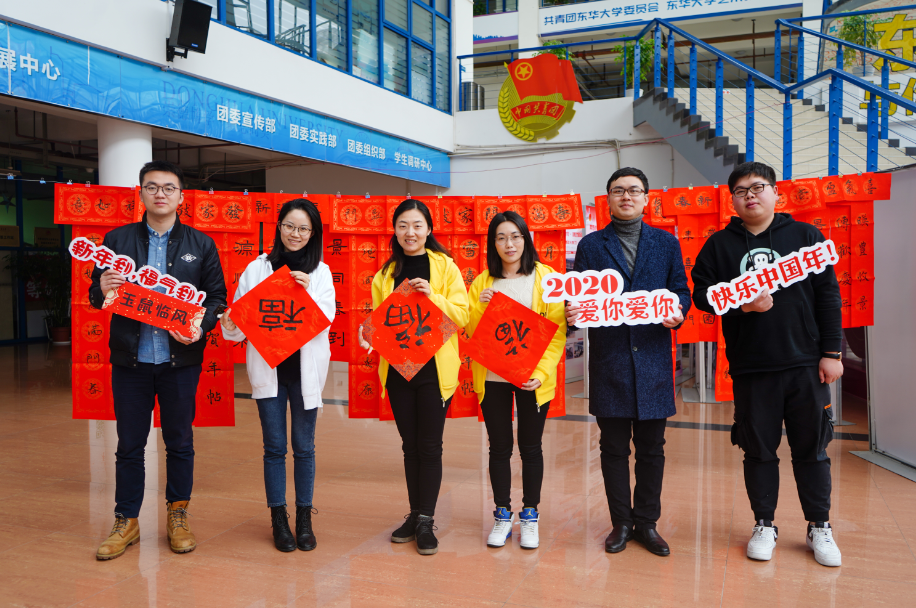 大厅内,人头攒动,师生们热情洋溢,有的挥舞翰墨体验一把书法魅力,有的驻足观看品赏一联书法之美,有的争先恐后为获一副新春桃符,一派喜气洋洋、温暖祥和。在人群中有这样几位特殊的观众,他们是东华的留学生,值此新春佳节,同学们教他们写“福”字,讲寓意,送春联,将中华优秀传统文化传播给他 们,用中国的新年祝福温暖异乡的学子.