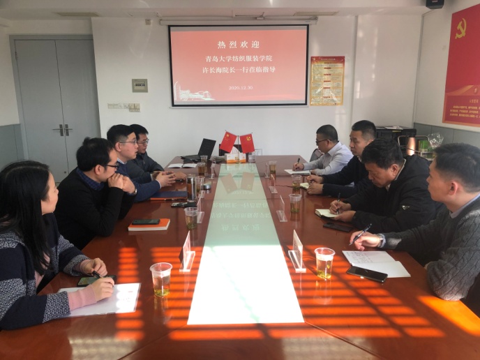 12月29-30日,青岛大学纺织服装学院代院长许长海、党委副书记张敏、副院长邢明杰、院长助理张春明一行来学院进行调研交流。学院党委书记李成龙、院长顾伯洪、副院长王富军、副院长许福军、党委委员孙宝忠、学院办公室主任章倩等出席调研交流活动。