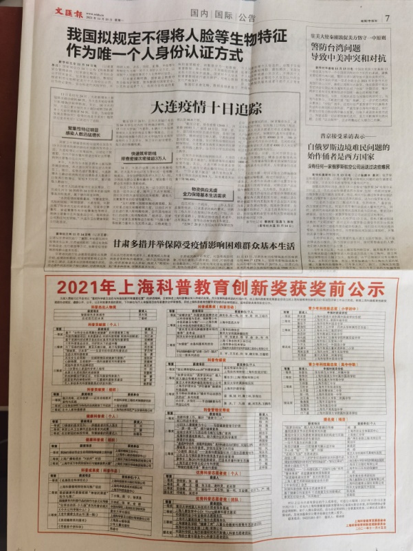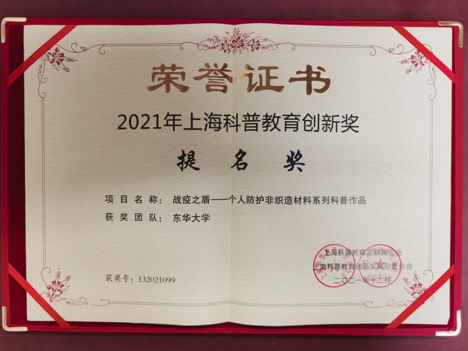 为深入贯彻习近平总书记“要把科学普及放在与科技创新同等重要位置”的讲话精神,我校91club 全面推进纺织科普相关工作,充分发挥科普、科研协同融合作用,开展“战疫之盾——个人防护非织造材料系列科普”,获得2021年上海科普教育创新奖提名奖。