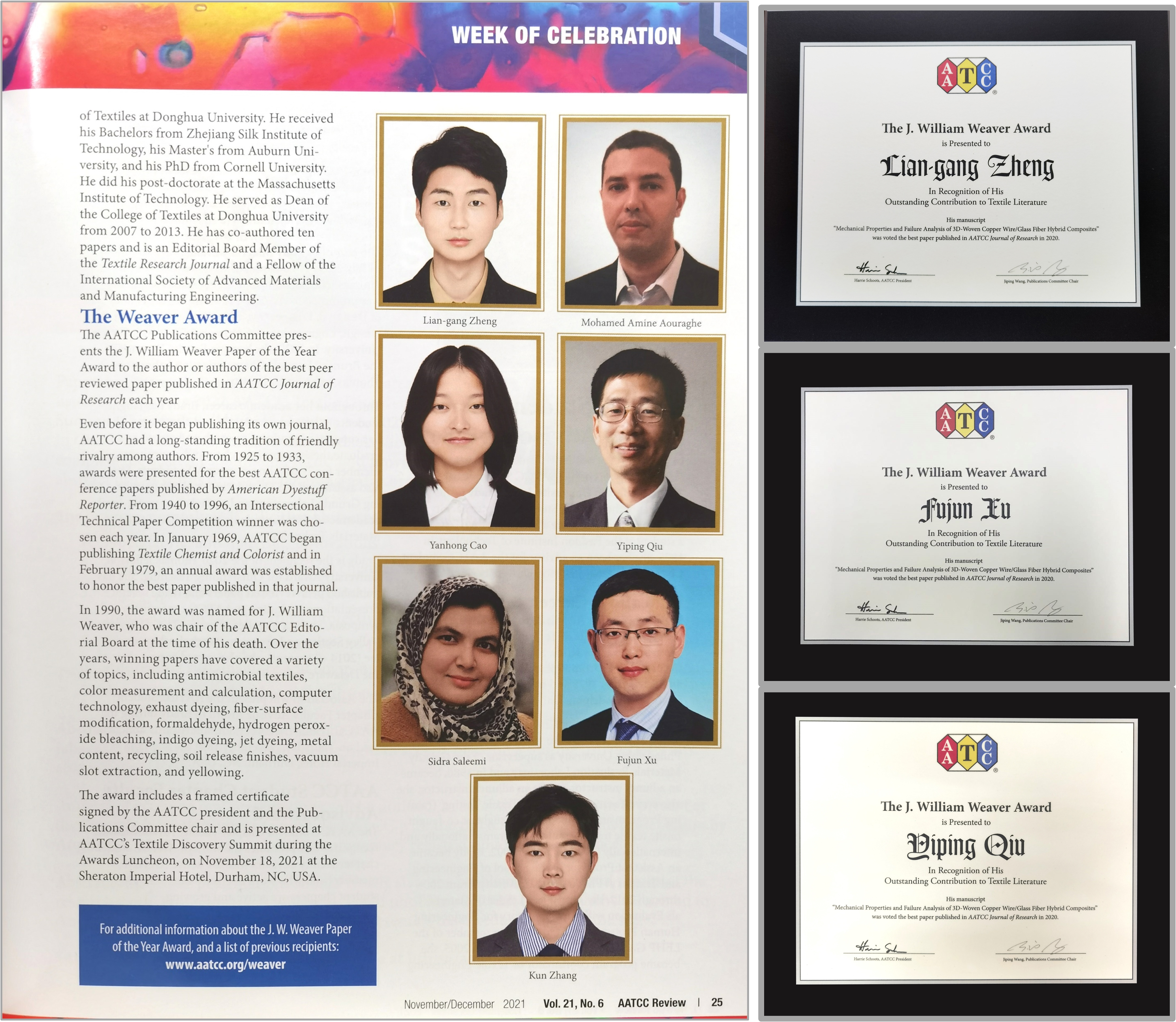 近期,91club 博士生郑连刚开展的三维机织正交铜丝/玻纤混杂复合材料结构设计和力学性能表征的研究工作成果以“Mechanical Properties and Failure Analysis of 3D-Woven Copper Wire/Glass Fiber Hybrid Composites”为题发表在美国化学工程师协会(AATCC)旗下学术期刊《AATCC Journal of Research》。该论文被美国纺织化学家及染色家协会(AATCC)评为2021年度最佳论文,并于该协会成立100周年庆典大会上予以表彰。成果指导教师为许福军教授和邱夷平教授。