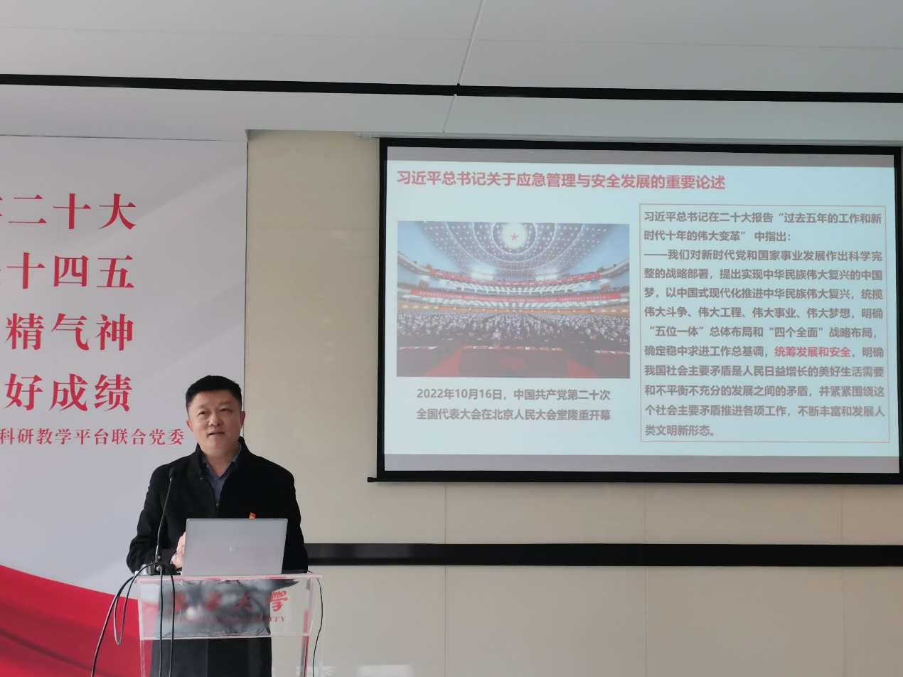 陈革以“防风险 除隐患 保平安”为题,带领大家共同学习了党的二十大报告中关于应急管理和安全发展的重要论述。他强调,党中央、国务院一贯高度重视校园安全工作,习近平总书记等中央领导同志先后作出一系列重要指示批示,高校实验室安全是高校校园安全的重要组成部分,号召大家坚持“安全第一、预防为主”,全面贯彻落实党的二十大精神,立足本职工作,持续做好实验室安全管理工作。他结合学校实验室安全管理工作现状,从安全责任体系、安全准入机制、安全教育培训、隐患排查治理、安全奖惩机制、应急能力建设等方面,介绍了具体落实举措,并给出下一步推进路径,希望大家以实际行动为学校事业高质量发展筑牢安全“防火墙”。