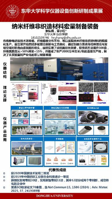 覃小红教授团队研发的纳米纤维非织造材料宏量制备装备,聚焦传统静电纺丝纤维细度不均、生产效率低、离散度高的瓶颈问题,破解该材料在防护、过滤、医疗等高端领域的应用制约。团队以“理论创新-技术发明-装备集成” 路径推进,先创建微纳米纤维介质诱导拉伸理论奠定基础,再创新发明空间对称自由液面圆形喷头(生产效率较传统提升 500),最终建成年产 2000万平方米连续化生产线。该装备不仅解决量产难题,还将纤维直径离散度从50%以上降至15%以下,并突破自由液面静电纺丝国际技术瓶颈。目前,项目获30项授权发明专利并实现技术转化,斩获2020年国家技术发明二等奖等荣誉,发表SCI论文70余篇,为国家战略领域提供关键材料支撑,确立我国在该技术领域的国际领先地位。