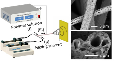 The co-authors of Wanjun Liu and Lei Zhu (Figure 1) have developed an in situ microfluidic electrospinning (IME) technique and achieved the controllable fabrication of ultrafine fibers with interconnected macro-pores (Figure 2). Specifically, a microfluidic nozzle has been employed which allows for the simultaneous electrospinning of solution immediately after mixing, thus overcoming the challenge of the electrospinning of unstable solutions, and facilitating the fabrication of macro-porous fibers through non-solvent induced phase separation. The diameter of the macro-porous fibers can be tuned from 1.80 ± 0.40 to 6.75 ± 0.48 μm by adjusting the solution concentration and the feeding rate of mixing solvent. The results indicated that macro-porous fibers exhibited higher specific surface area (48.66 ± 8.30 m2 g−1), larger pore size (116.73 nm) and pore volume (0.169 ± 0.007 cm3 g−1) than conventional electrospun porous fibers, enabling the high oil absorption capacities of 95.68, 57.98, and 34.82 g g−1 for silicon oil, motor oil, and peanut oil, respectively. This method has greatly expanded the solution scope for electrospinning from stable solution systems to unstable or substable solution systems, thus providing intriguing opportunities for the investigation and fabrication of heterogeneous fibers by in situ mixing of various immiscible solvents/solutions. These findings can serve as guidelines for the electrospinning of ultrafine fibers with interconnected macro-pores (>50 nm)